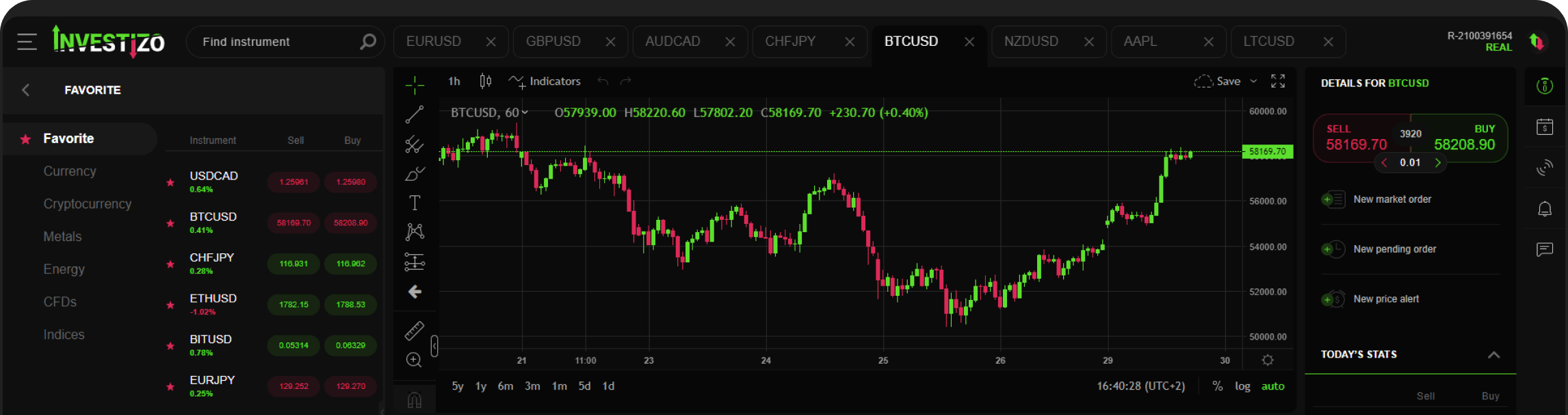 Jenis akaun yang tersedia oleh Investizo: REAL ECN, REAL STANDARD dengan syarat perkhidmatan dan dagangan yang lebih berkualiti.